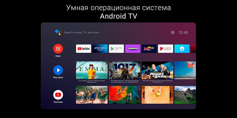 Устройство поставляется с умной операционной системой Android TV. Она предлагает свыше 400000 фильмов и 5000 приложений.