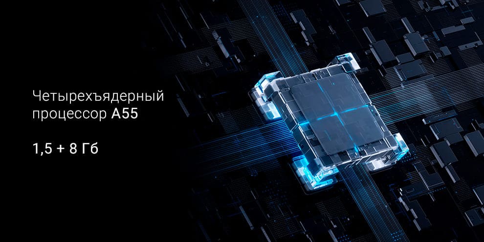 В Xiaomi TV A2 32" встроен четырехъядерный процессор А55 в сочетании с 1,5 и 8 Гб памяти. Он способствует плавной работе телевизора и гарантирует много места для ваших любимых приложений.